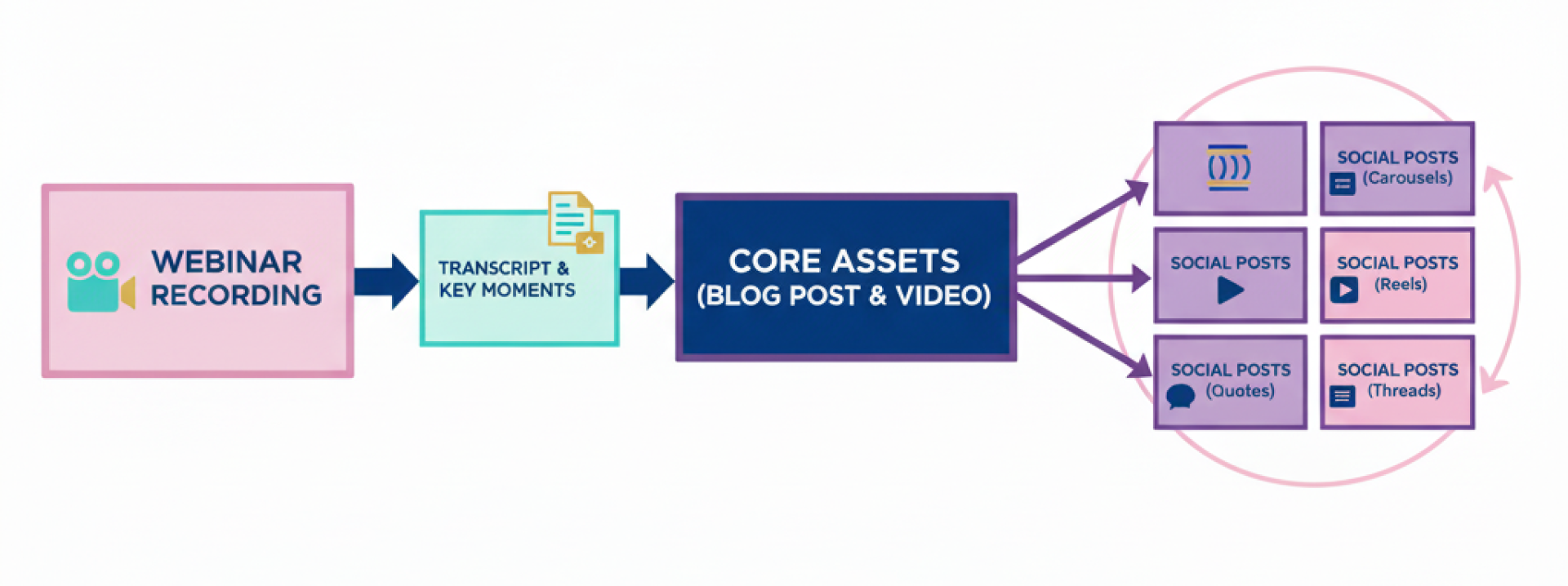 Pravkar ste končali. 60-minutni spletni seminar, poln vpogledov v industrijo, strokovnih intervjujev in živahne seje vprašanj in odgovorov. Dogodek je bil uspešen, a zdaj sedi v mapi v oblaku, njegov potencial pa počasi bledi.