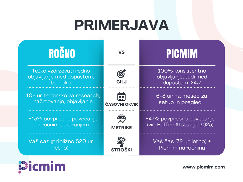 - AI orodja (kot Picmim) analizirajo vaše podatke in napovedujejo optimalne čase